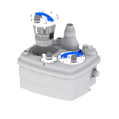 The Sanicubic 2 Pro is a high performance macerating pump for commercial use. Contains two separate, load balanced pumps with high performance macerating systems and will operate alternately. In the event of inflow overload, both motors run at the same time, or in the unlikely event that one motor fails, the other one will take over.